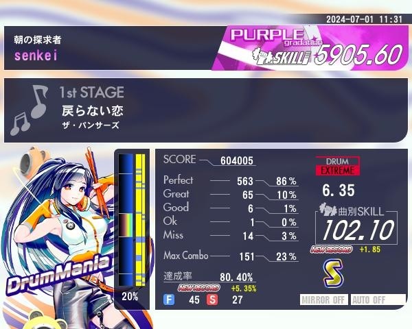 超えた…のか…?フィルインが連チャンするの手が絡まってスティックポロって落とすリスクも高くて結構閉店さえしていた曲でした…