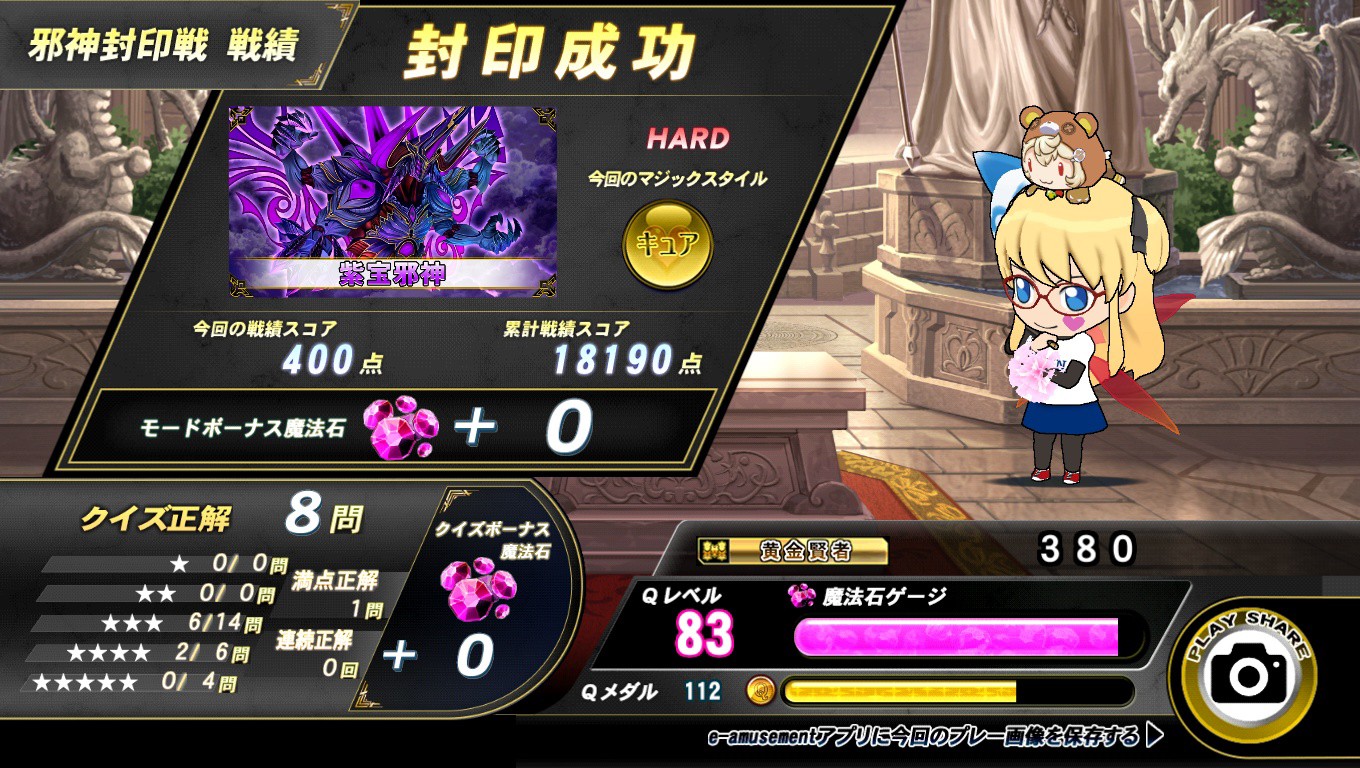 紫宝邪神封印戦(ハード)の成績は封印成功3回、敗北1回でした。