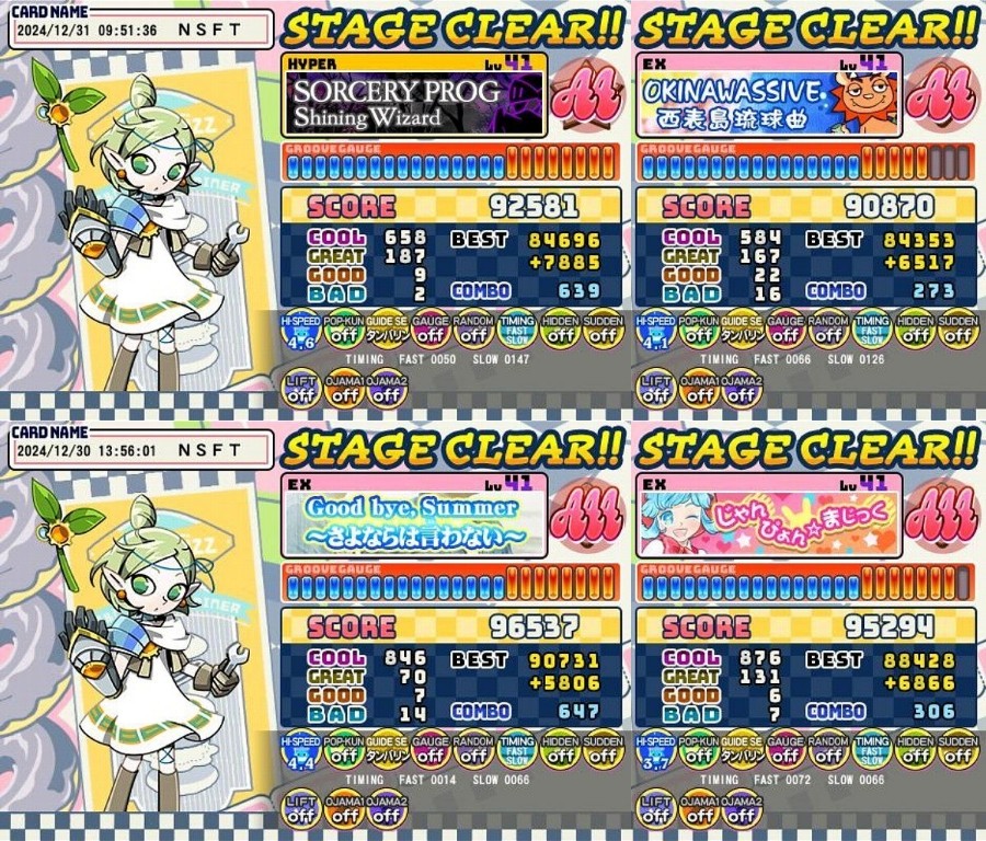 pop'n中級域更新集その3。 ・ソーサリープログレッシヴ (H・Lv41):銅◆→★&AA ・オキナワッシヴ (EX・Lv41):AA ・Good bye, Summer 〜さよならは言わない〜 (EX・Lv41):AAA ・じゃんぴょん☆まじっく (EX・Lv41):AAA 久しぶりにpop'n版のシャイウィザ触れたけど癖のつきやすそうな階段配置ですな (^^;