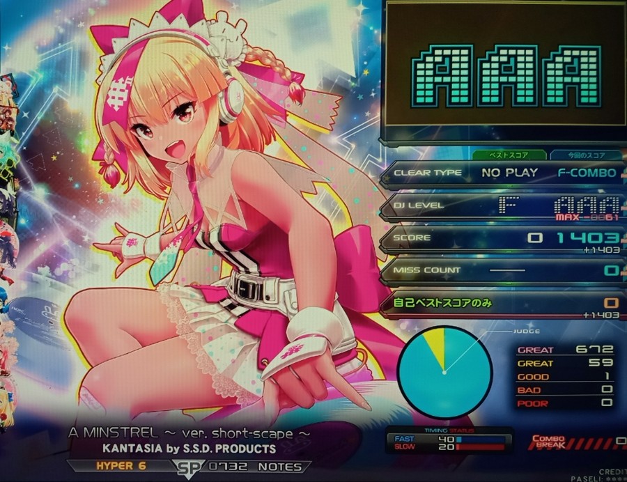 A MINSTREL ~ ver. short-scape ~(H) SP右サイド MAX-61 ライトニング空いてなくて旧筐体でやったんだけど、半分以下のレベルならスコア出るかもしれん。