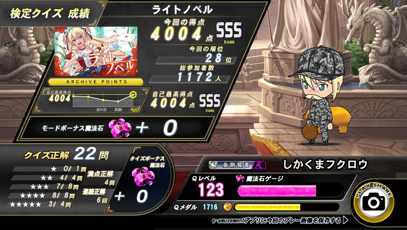 検定4000点報告。 中身が50代おじさんの可能性が僅かでも残る検定。 3900点手前で迎えた最終問題がそないに難しくないOXでキレ散らかしてたら意外に伸びて今恥ずかしさのあまり見猿になってる。 今見たら★1間違えてますね。何だっけ。