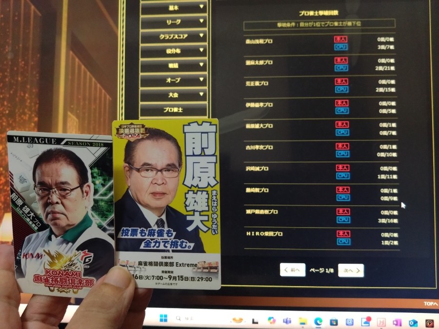 新シリーズ統一稼働となるも訃報から。私も思い出を。 シリーズ2からプロ雀士が登場の謳い文句。そこで初めて対戦したのが前原プロでした。そもそもプロとの初対戦で相当聴牌っており、結果はプロ1位の4位。(それから幾多のプロと対局し、撃破もしたりと成長を感じる事も) さて写真は、今でこそプロとの対戦履歴がetc.>出来事リストに残るが、シリーズ2ではそれすらない状態なので、証拠となるものがせいぜいこれだけ。+カーコネでコナミ所属時と、昨年の選抜戦でのカード。(前段の通り最初のプロとの対戦、これも今でこそカーコネでの対戦記録がプリントアウトされるがその代わりとして)対戦並びに思い出をありがとうございました。r.i.p.† P.S. シリーズが始まったばかりで消えてないが、運営はいずれ、本人死亡を理由にデータ消去となるだろう…