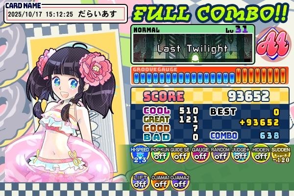ラストトワイライトN、フルコン出来ました。ちょっとノーツ多めですね。