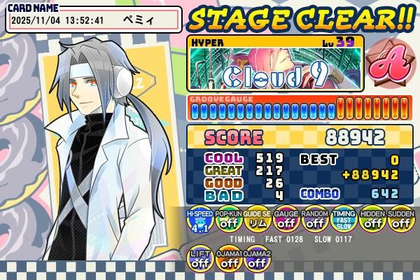 Cloud 9(H)、初見でした。とても叩きやすかったです。余裕があったおかげで階段がきれいめに叩けたのも嬉しい…!