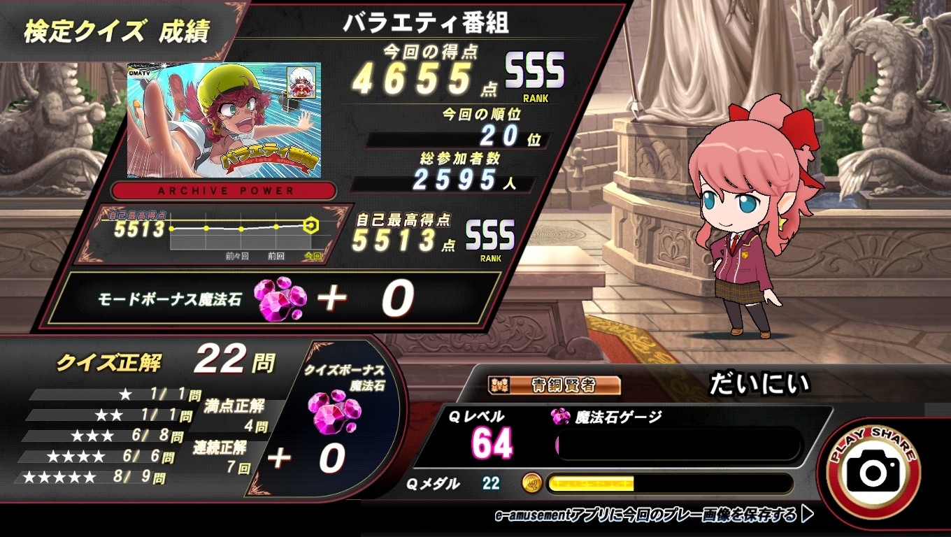QMA緋のアルカディアを5クレ。 メイン(だいにい@メディア)…検定クイズ×5(バラエティ番組×5)。 画像は本日のお笑い検定の最高スコア。 ◆プレーヤー情報 https://ameblo.jp/dai2san/entry-12932945221.html @ソニックワールド大村店