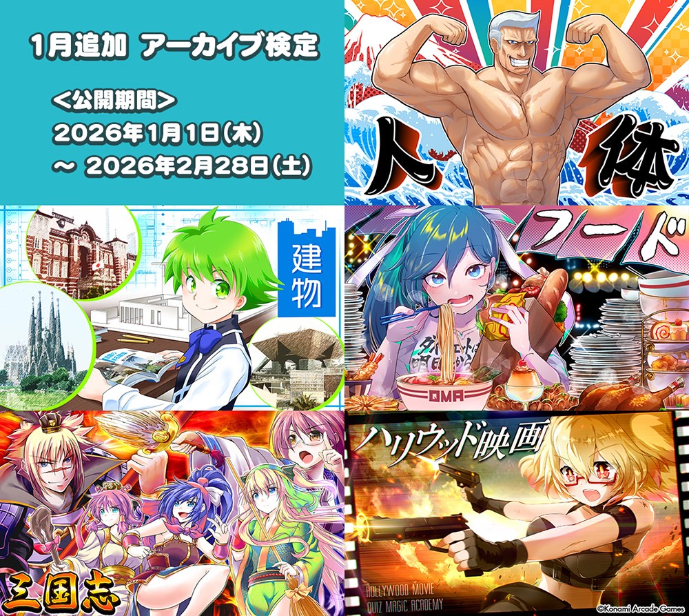 1/1(木)からアーカイブ検定に「人体」「建物」「フード」「三国志」「ハリウッド映画」を追加します!どうぞお楽しみに! #QMA #緋のアルカディア