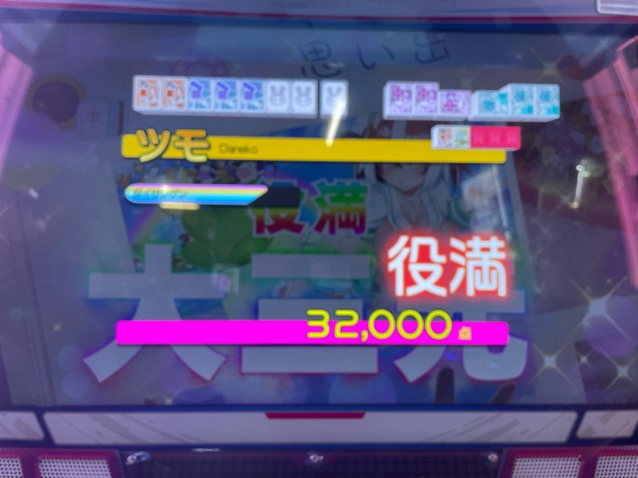 本日の戦績は2-2-1-0でした。 諸用のため早期撤収です。 本日のハイライトは久方ぶりの役満、大三元ッ!(カメラのセンサーが汚れててピンぼけしてますが...) 普段は狙いに行かないので自然に揃うと嬉しいですね。